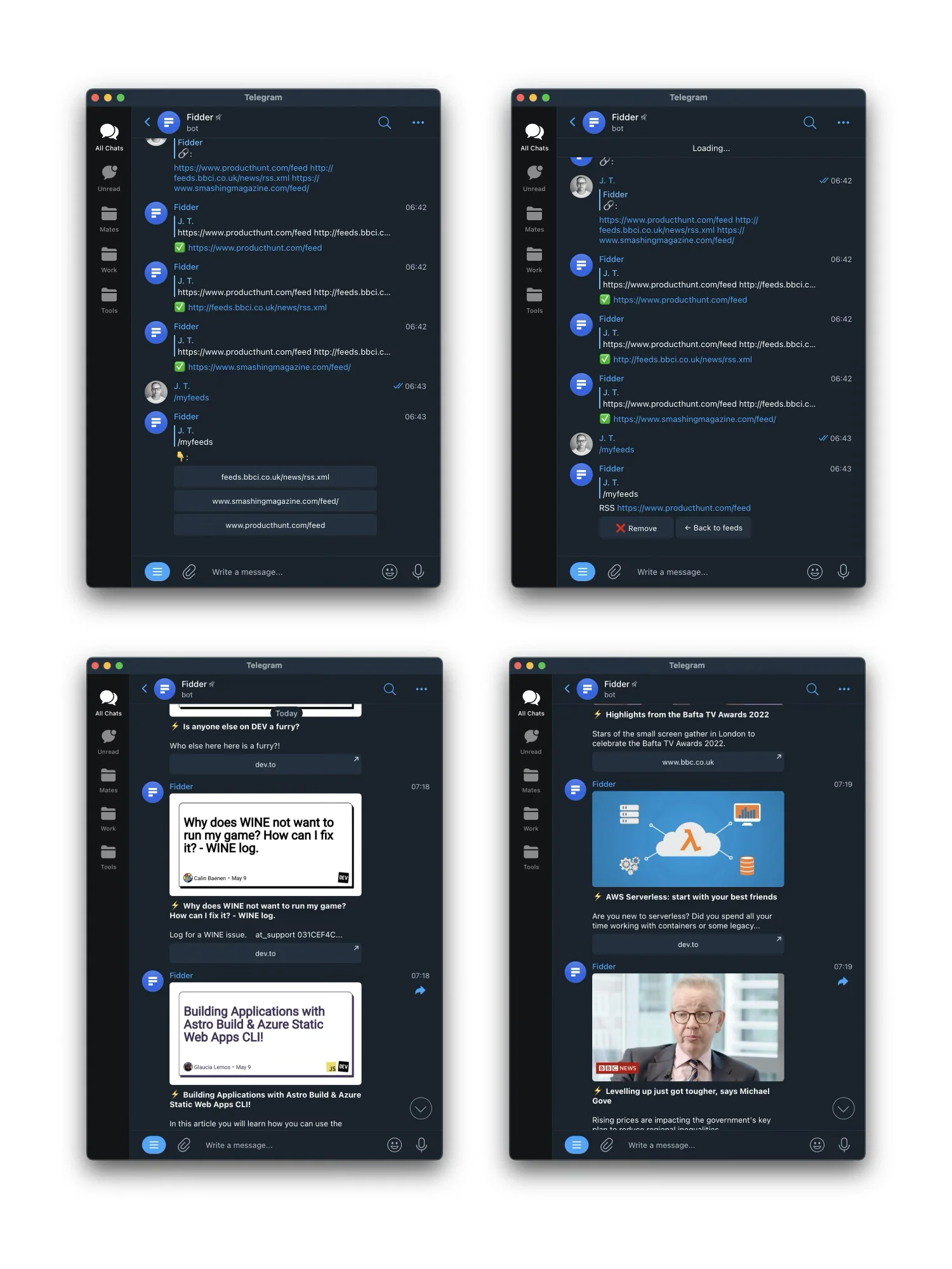 Screenshots of Fidder for Telegram from 2022, prepared for Product Hunt launch.