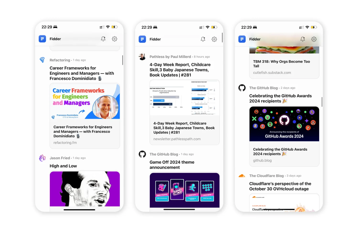 Screenshots of Fidder web application showing feed and settings pages on desktop, in-browser view.Subscribe to the newsletter: