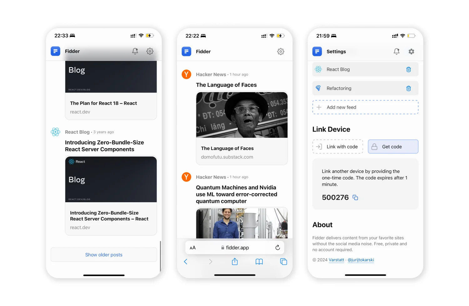 Screenshots of Fidder web application showing: only fresh post view state, how it works form browsers and settings page with one-time code to link devices.