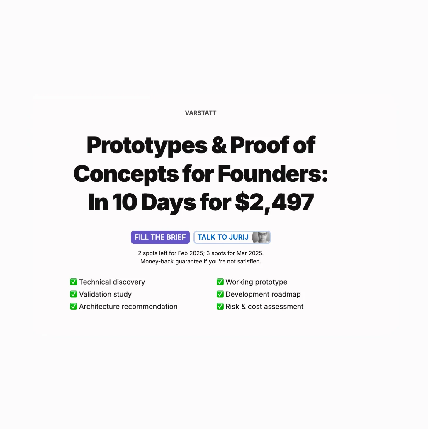I have 2 available spots for February 2025 to make a proof of concept. Want to validate your idea quickly? Fill out a brief or book a call.